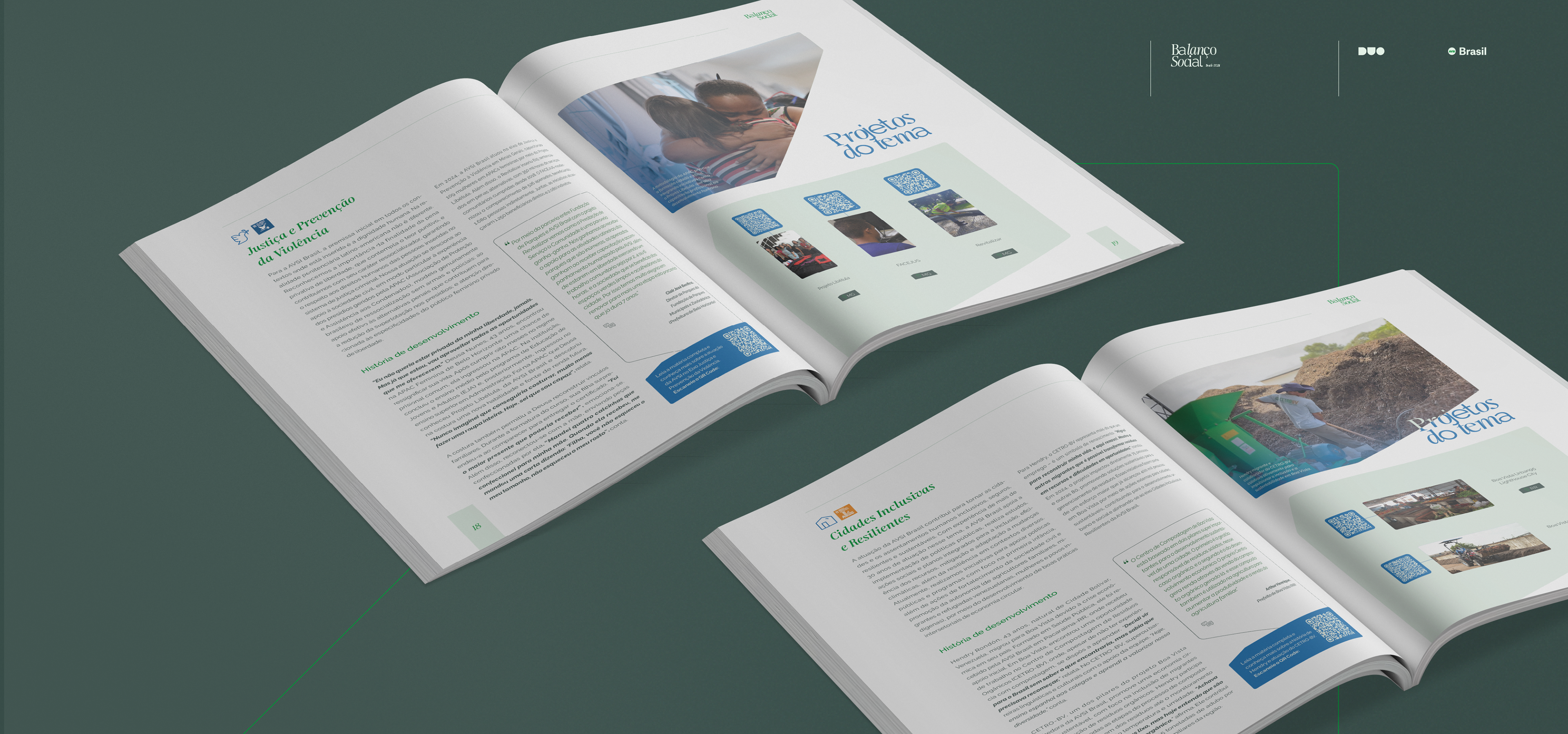 O design adota uma estrutura modular, com seções claras dedicadas às áreas estratégicas como água e segurança alimentar, cidades inclusivas, emergências climáticas e migração, entre outras. Inspirado nas Diretrizes Estratégicas 2024-2028, o layout prioriza a legibilidade e o fluxo narrativo, utilizando grids flexíveis para integrar textos introdutórios, infográficos e depoimentos reais de comunidades, promovendo uma experiência de leitura imersiva que destaca a presença, a pessoa e a comunidade como pilares centrais. As cores do branding da AVSI — tons de azul profundo para confiança e estabilidade, verde vibrante para sustentabilidade e crescimento, e laranja sutil para energia e ação — são aplicadas de forma estratégica: dominando cabeçalhos e elementos gráficos para reforçar a identidade institucional, enquanto tons neutros garantem equilíbrio visual e acessibilidade.